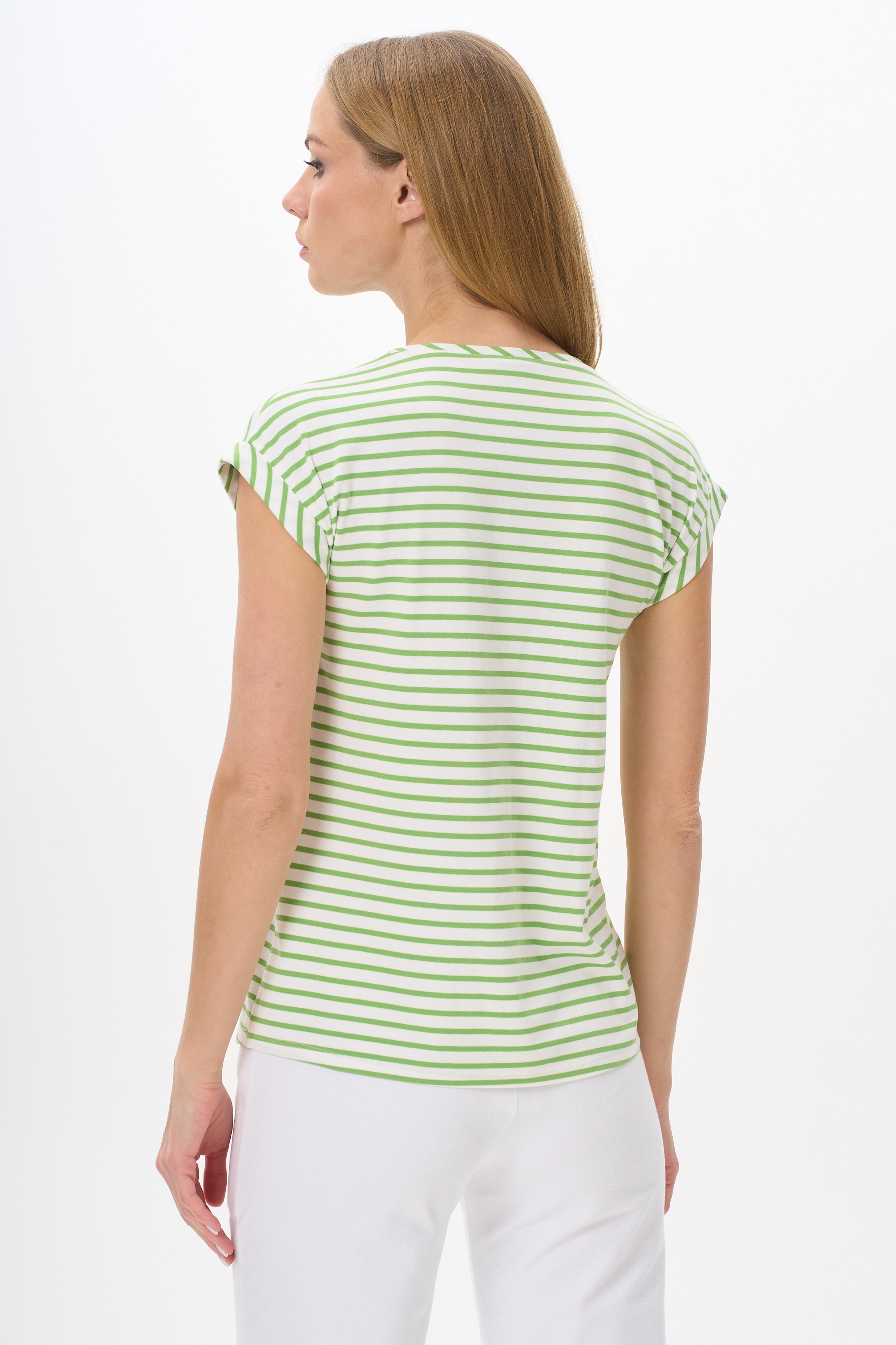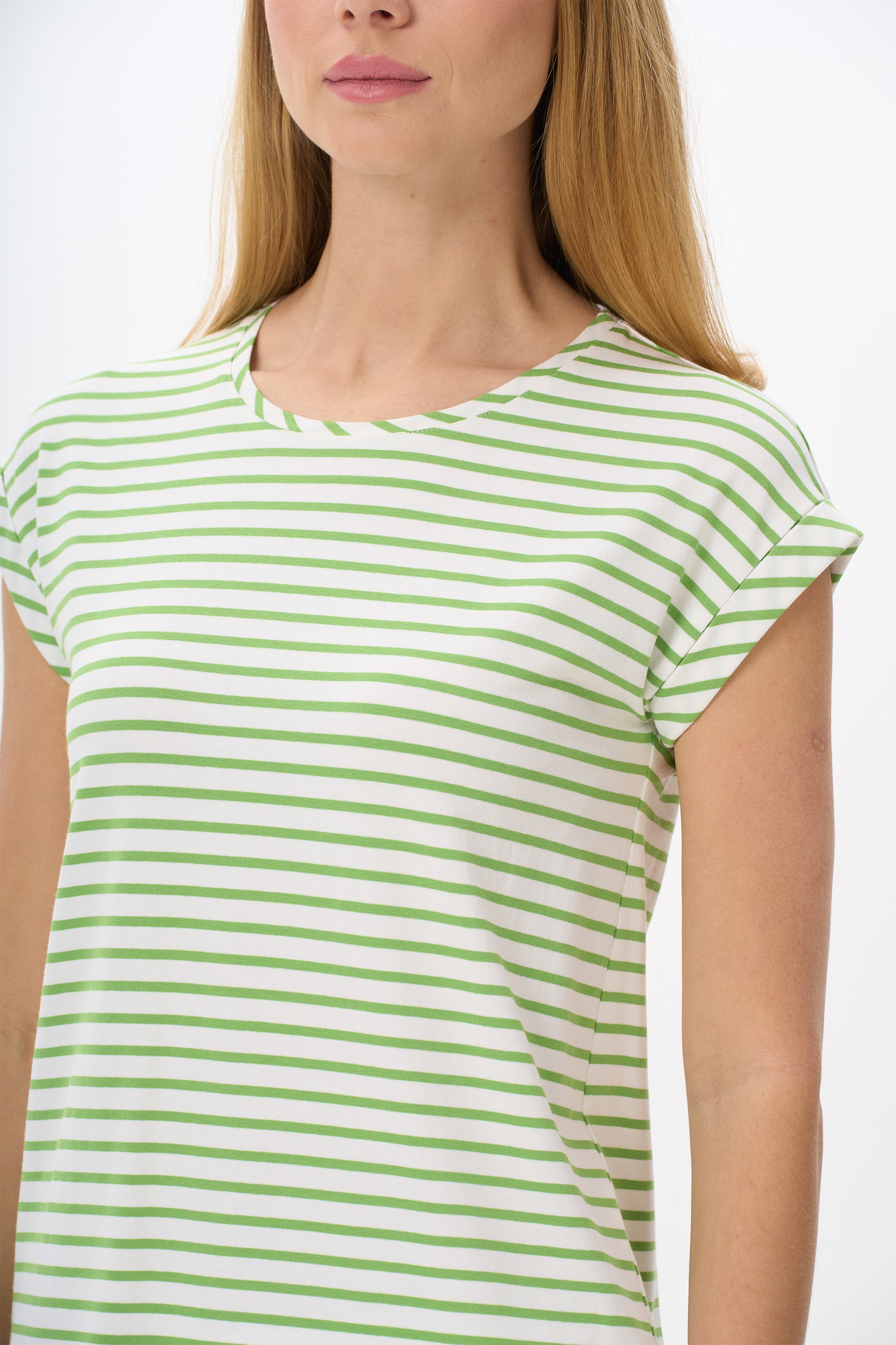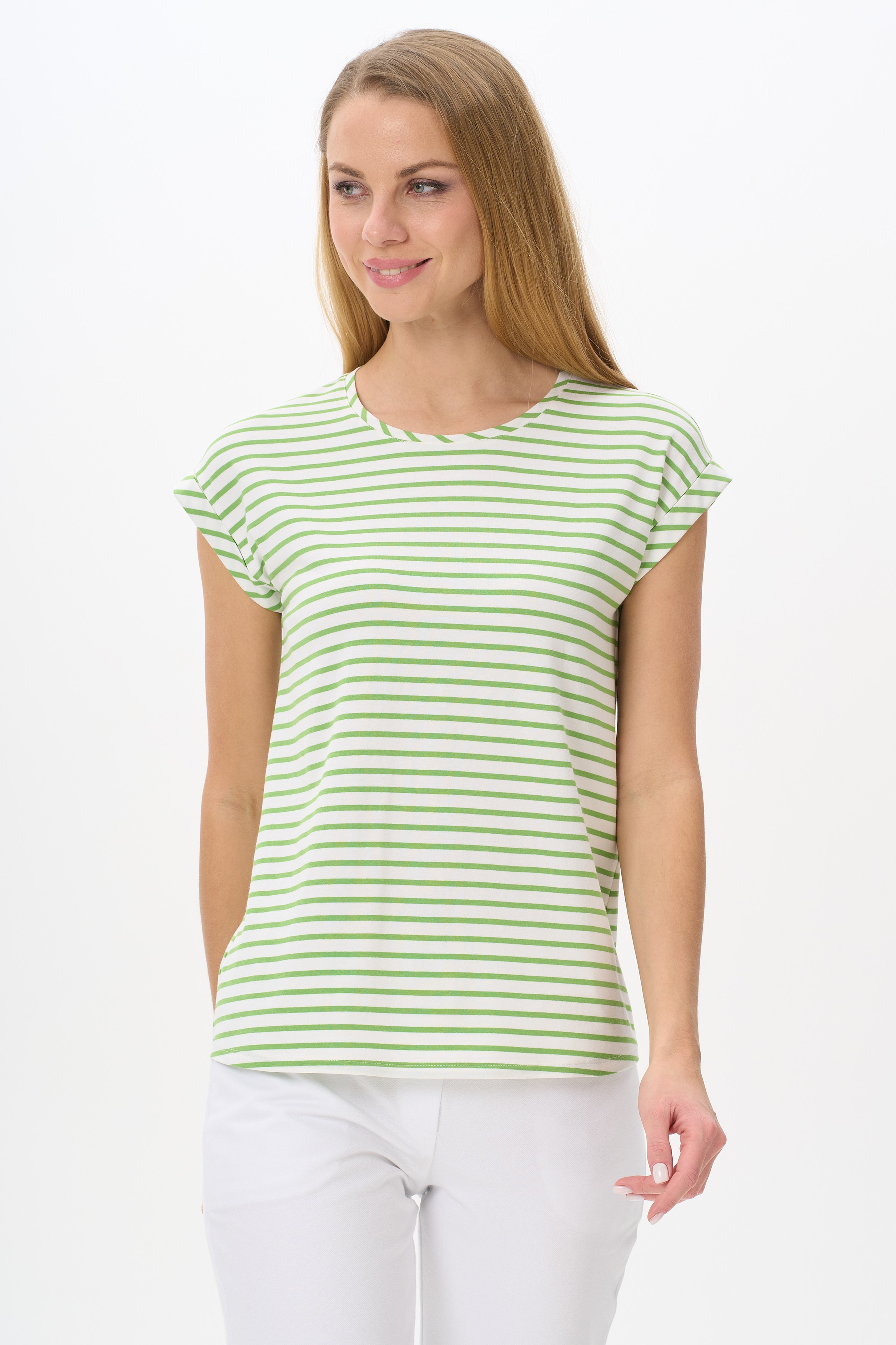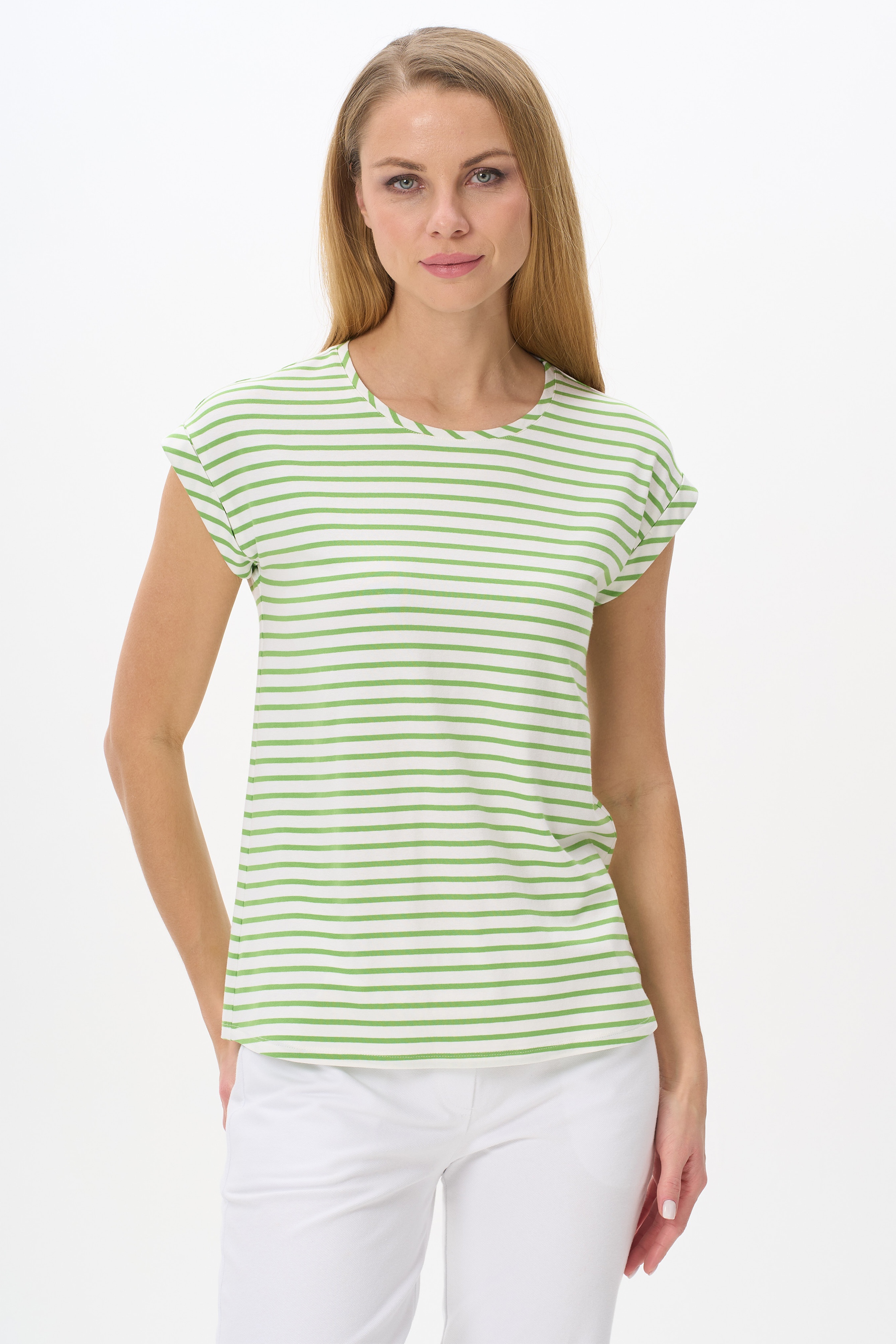 92% вискоза, 8% эластан Футболка прямого силуэта из вискозного полотна в полоску. Модель со спущеной линией плеча, цельнокроеные короткие рукава с зафиксированными подворотами, круглый вырез горловины, длиной чуть ниже середины бедер. Универсальная, комфортная модель на любой случай. Рост модели 175 см.