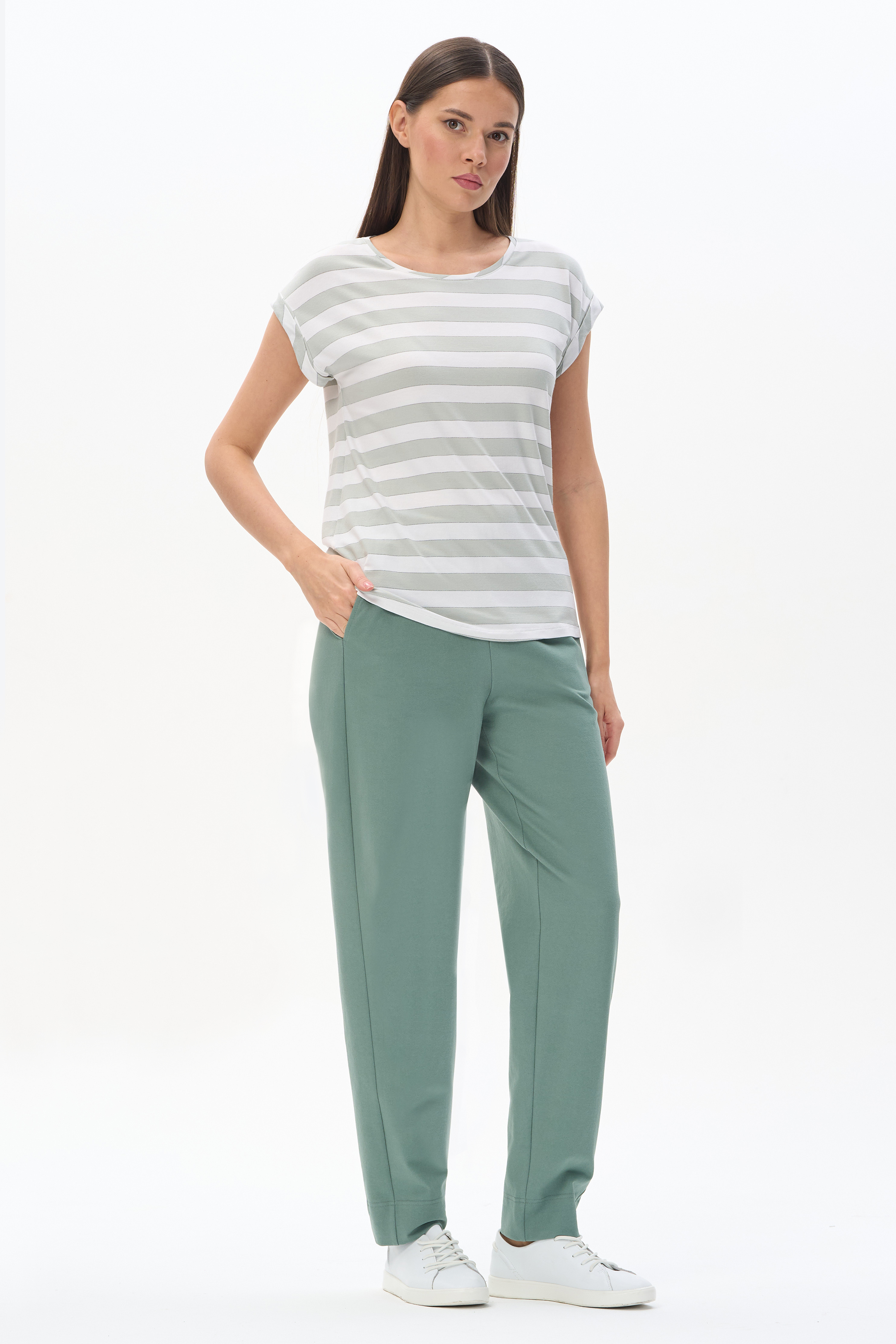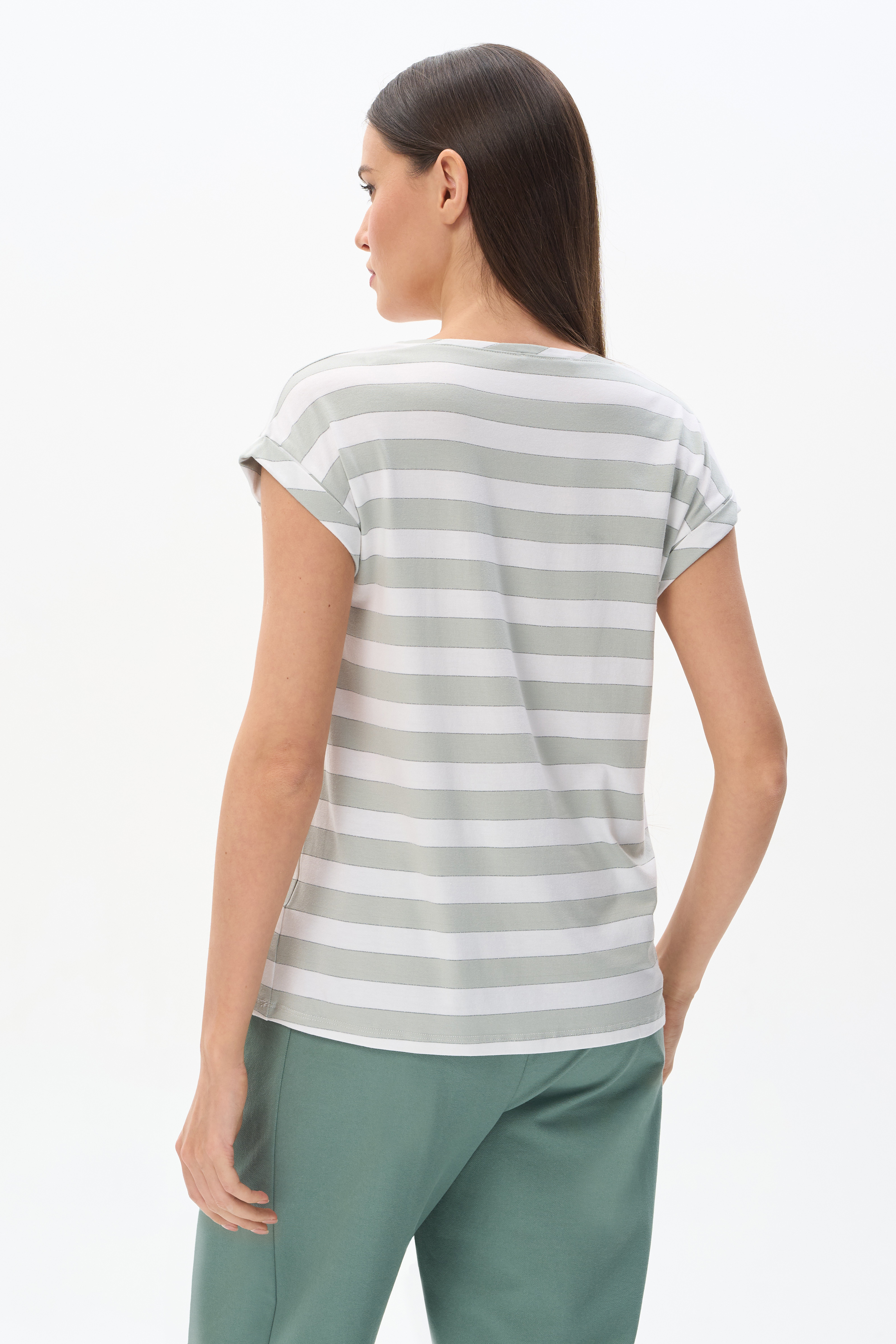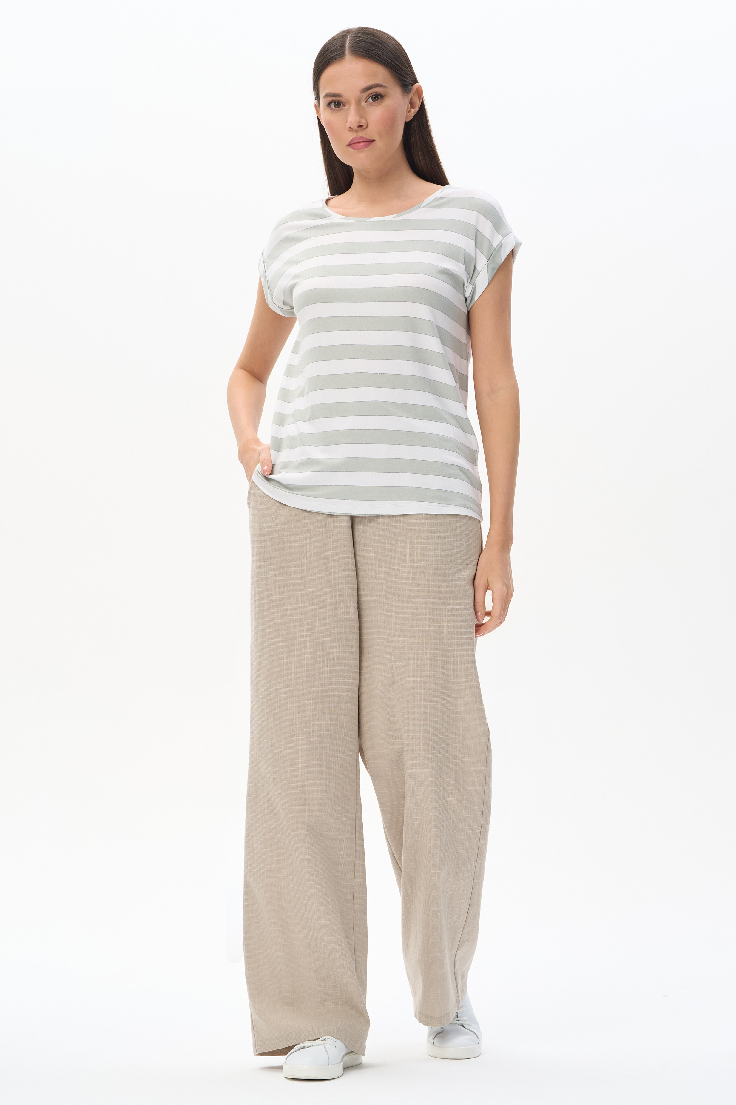 92% вискоза, 8% эластан Футболка прямого силуэта из вискозного полотна в полоску 200 гр. Модель со спущеной линией плеча, цельнокроеные короткие рукава с зафиксированными подворотами, круглый вырез горловины, длиной чуть ниже середины бедер. Универсальная, комфортная модель на любой случай. Рост модели 175 см.