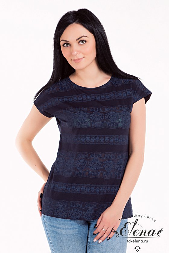 Футболка пошита из деворе - ткани, украшенной декоративным фактурным рисунком, напоминающим витраж. Горловина имеет круглый вырез, рукав короткий, цельнокроеный.