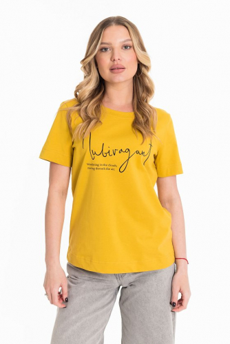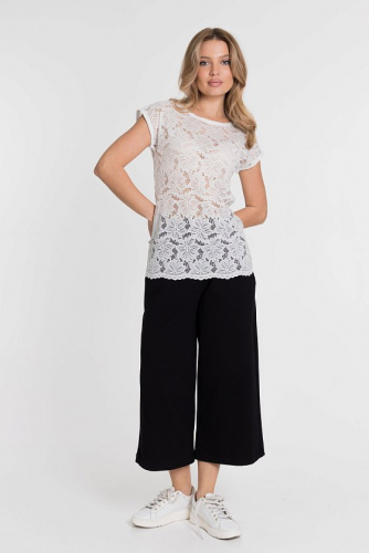 Футболка выполнена из кружева различных рацветок. Горловина с круглым вырезом, короткий цельнокроеный рукав.