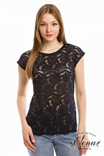 Футболка выполнена из кружева различных рацветок. Горловина с круглым вырезом, короткий цельнокроеный рукав.