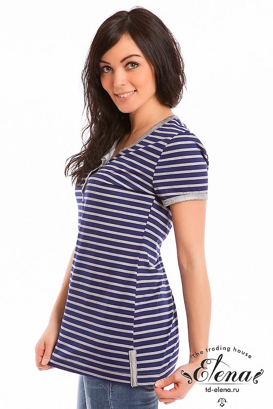 Футболка выполнена из кулирного полотна с набивкой в полоску. Рукав короткий, горловина имеет круглый вырез с имитацией планки с застежкой на пуговицы. В качестве отделки рукава и горловина изделия обработаны бейкой серебристого цвета из вискозы.