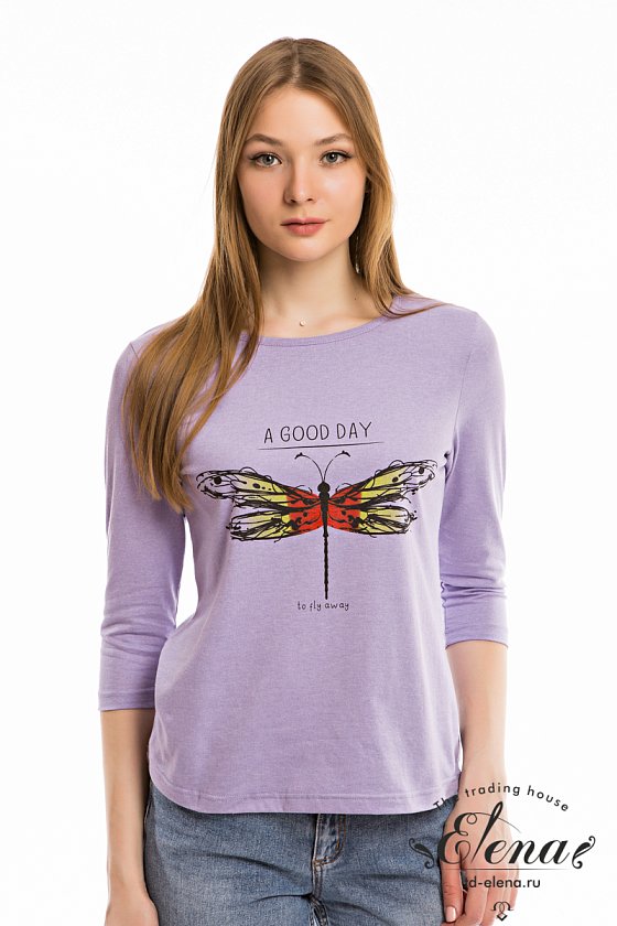 Футболка женская выполнена из кулирки. Рукава длиной 3/4, вырез горловины округлый. Спереди нанесён оригинальный принт.