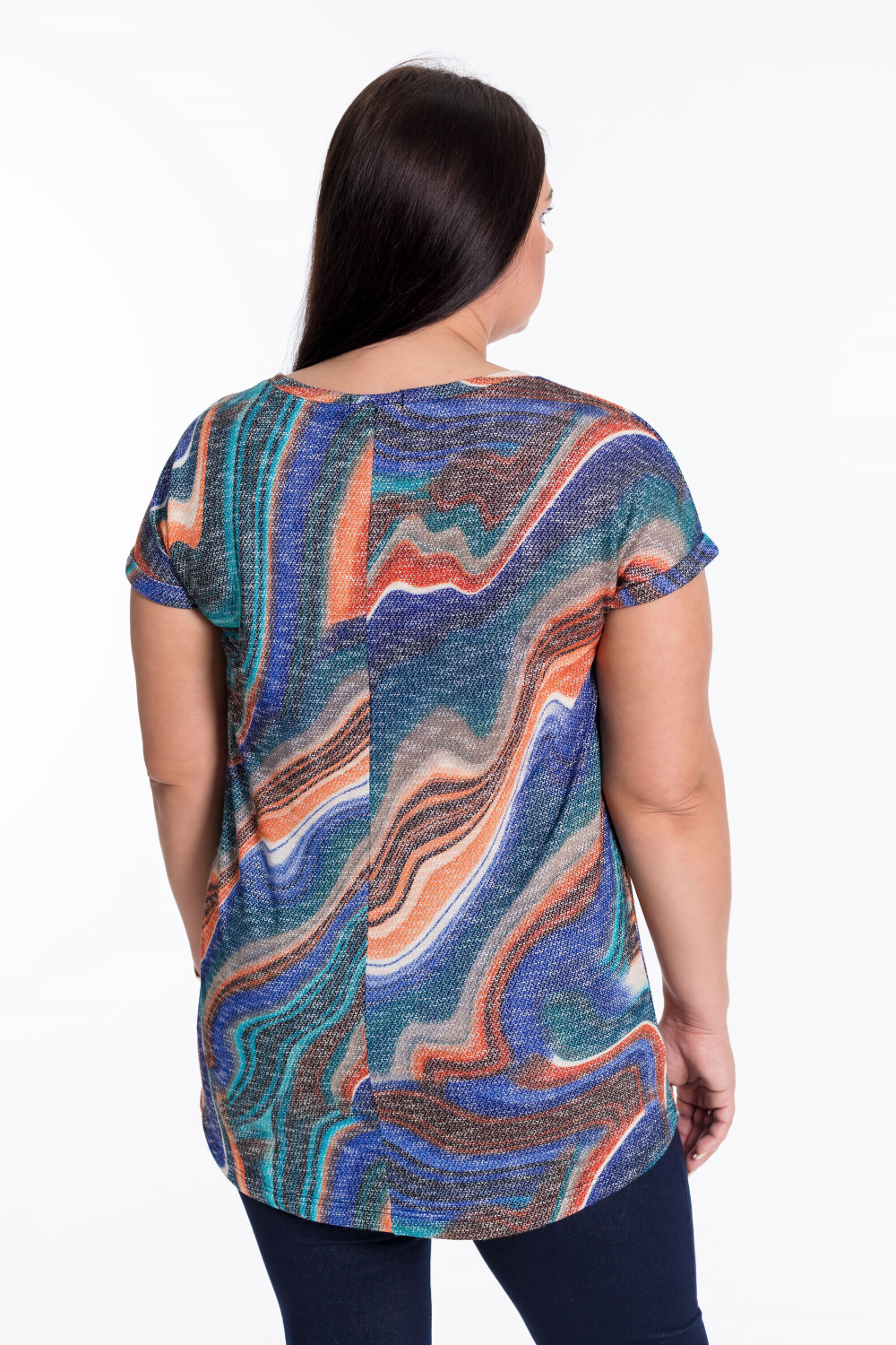 Футболка выполнена из вязаного полотна (набивка "цветные разводы"). Со спущенным плечом и мягким V-образным вырезом, обработанным планкой. По низу рукавов отложная планка. Низ изделия разноуровневый, спинка длиннее полочки. На спинке шов.
