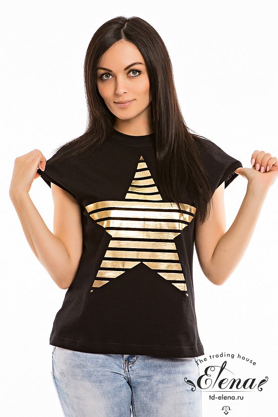 Футболка со спущенной линией плеча выполнена из однотонной кулирки фламли. Горловина оформлена притачной планкой. Спереди расположен принт.