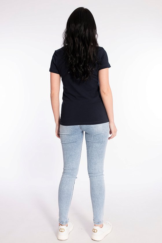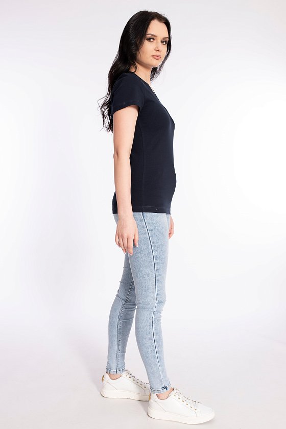 Футболка выполнена из полотна кулирка с лайкрой. Силуэт приталенный, короткий рукав. Слева настрочен небольшой карман с декоративным флажком. На планке V-образного выреза горловины пришиты пуговицы.