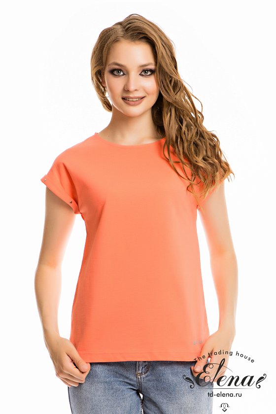 Футболка выполнена из однотонного полотна кулирка фламли. Горловина с круглым вырезом, короткие цельнокроеные рукава с отворотами, украшенными металлическими хольнитенами. Внизу, спереди нанесён принт.