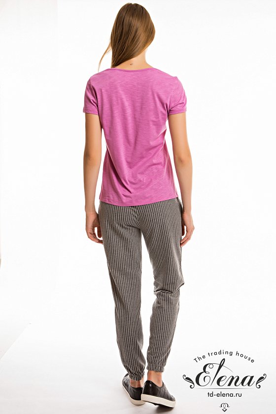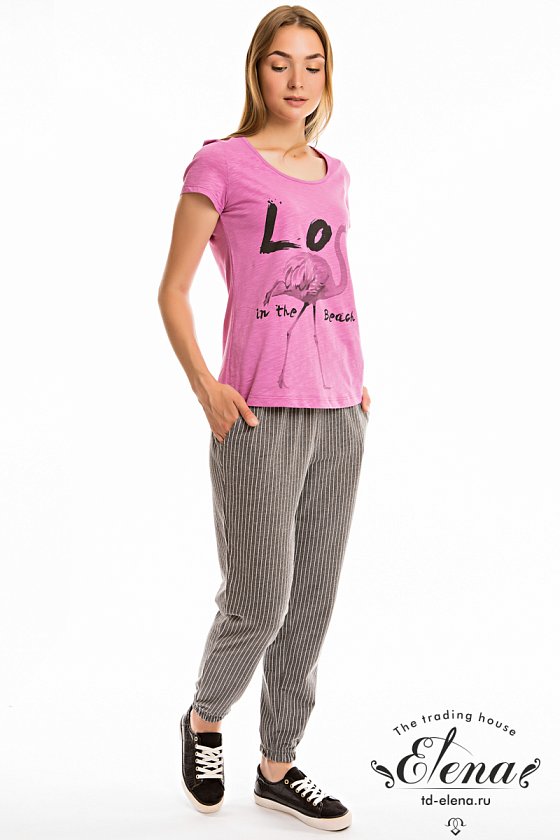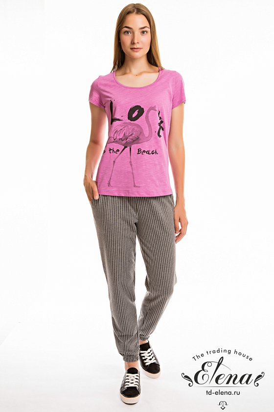 Футболка выполнена из полотна кулирка фламли. Спереди расположен принт. Силуэт приталенный, короткие рукава и круглый вырез горловины.