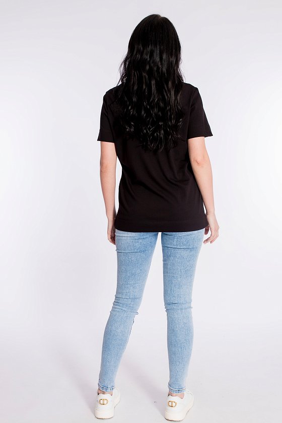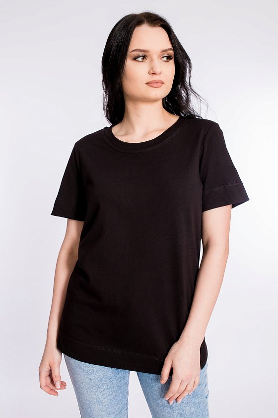 Футболка из однотонной кулирки, 100% хлопок. С коротким втачным рукавом и притачной планкой по горловине.