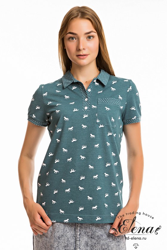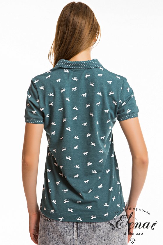 Футболка-поло из полотна пике с набивным рисунком. Воротник, планки застёжки, рукавов и верх нагрудного кармана из отделочного полотна. Воротник с застёжкой на четыре пуговицы.
