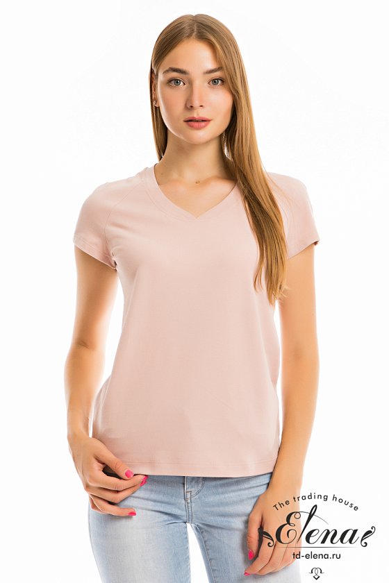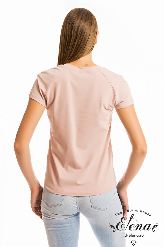 Футболка выполнена из х/б полотна с лайкрой. Вырез горловины V-образный, рукава короткие покроя реглан. На левом рукаве расположен термопринт.