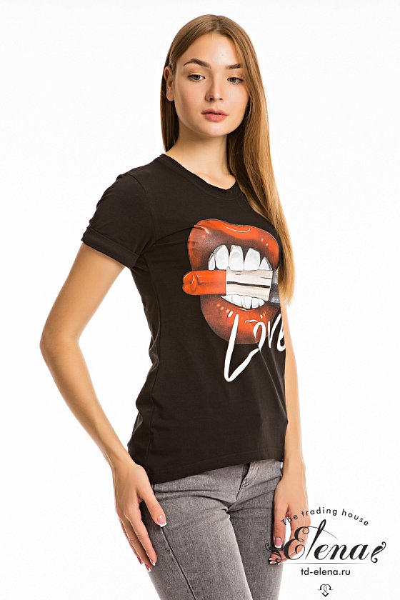 Футболка выполнена из кулирки с лайкрой. С коротким втачным рукавом с отложной манжетой. Круглая горловина с притачной планкой, спереди нанесён принт. Низ футболки разноуровневый.