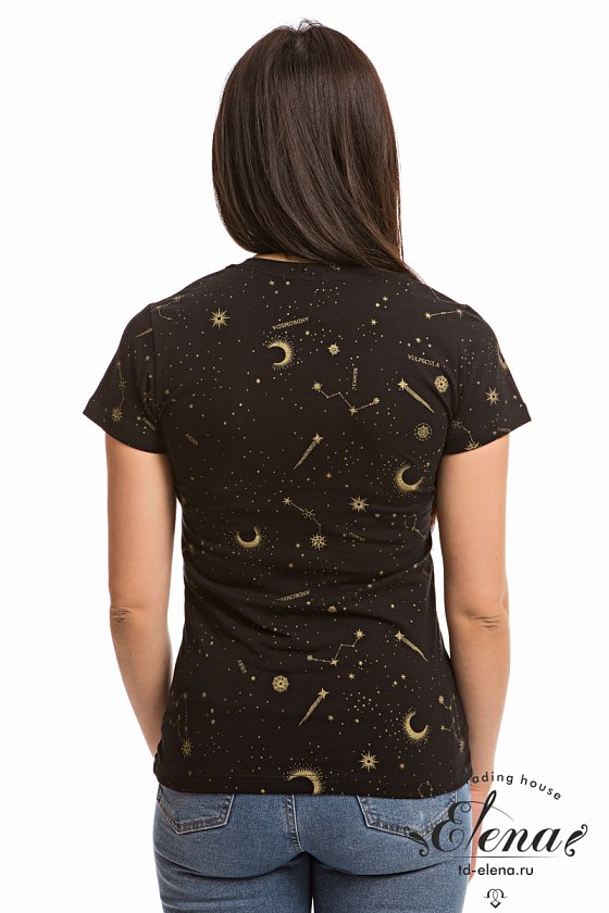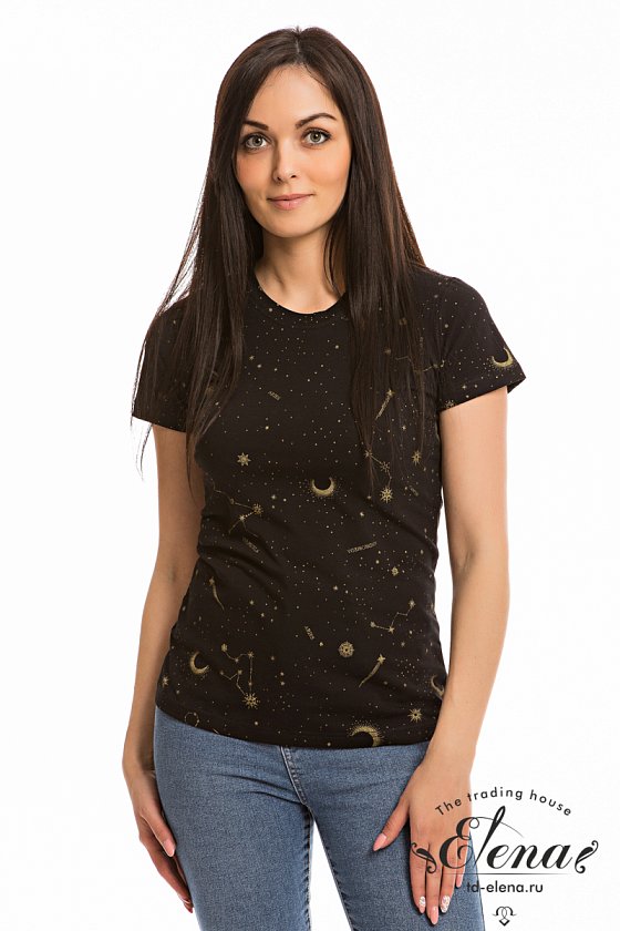 Футболка из кулирки с лайкрой с коротким втачным рукавом. Круглый вырез горловины с притачной планкой.