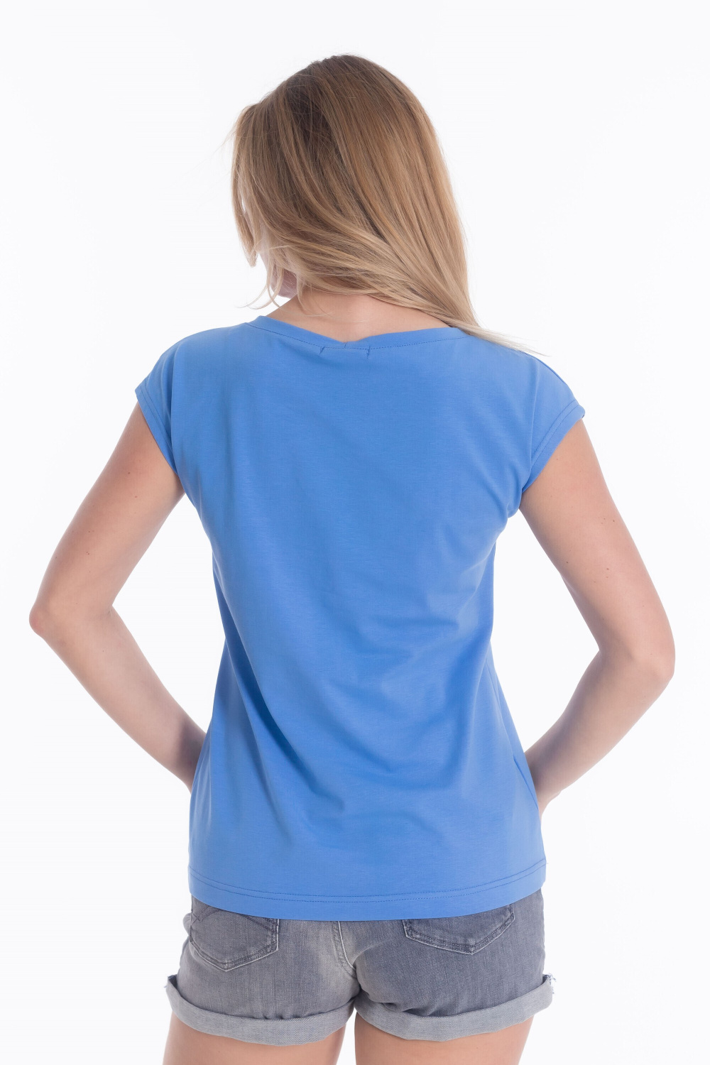 Женская футболка — отличный выбор для повседневного гардероба. Она изготовлена из мягкой и эластичной ткани — однотонной кулирки с добавлением лайкры, что обеспечивает комфорт при носке и свободу движений. Горловина футболки имеет форму «лодочки», линия плеча слегка спущена, а короткий рукав добавляет изделию лёгкость. Однотонный дизайн футболки дополнен принтом спереди, что придаёт ей стильный вид.