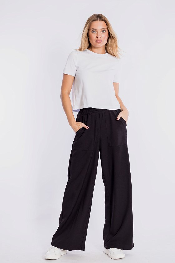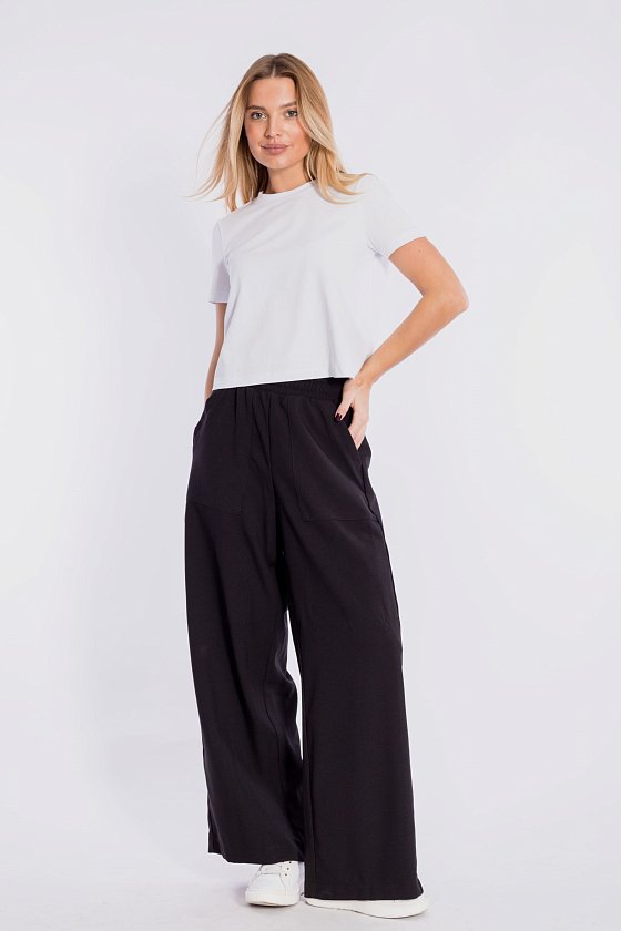 Футболка из однотонной кулирки с лайкрой. Укороченная, прямая, с коротким втачным рукавом. Вырез горловины круглый, обработан планкой.