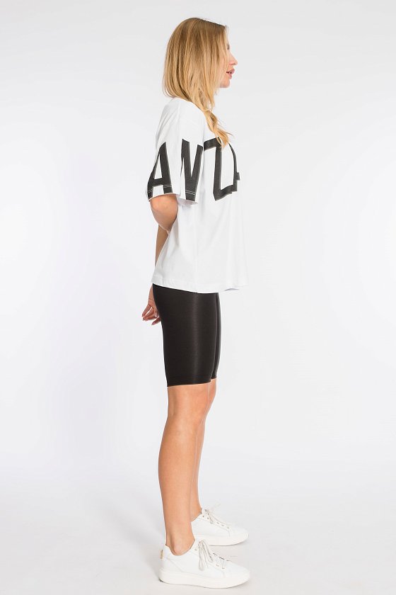 Футболка свободного силуэта выполнена из х/б полотна. Вырез горловины круглый. Спереди и на рукавах нанесён принт.