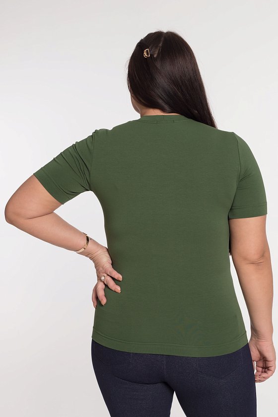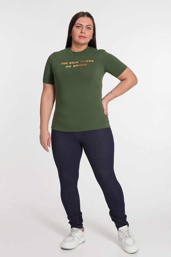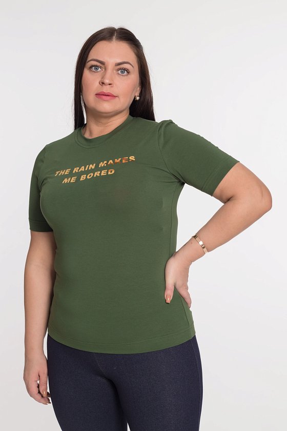 Футболка женская, облегающего силуэта, выполнена из кулирки с лайкрой. Горловина с круглым вырезом, рукав короткий. Спереди нанесён термопринт.