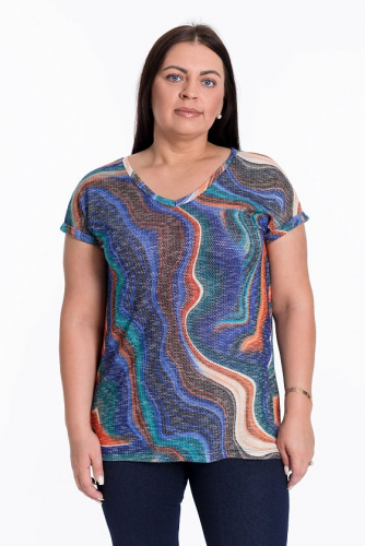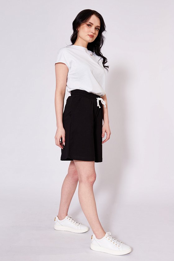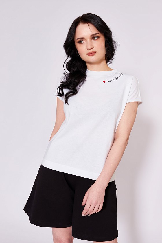 Футболка выполнена из кулирки, 100% хлопок. Линия плеча спущена, вырез горловины оформлен планкой. С левой стороны расположена вышивка.