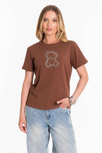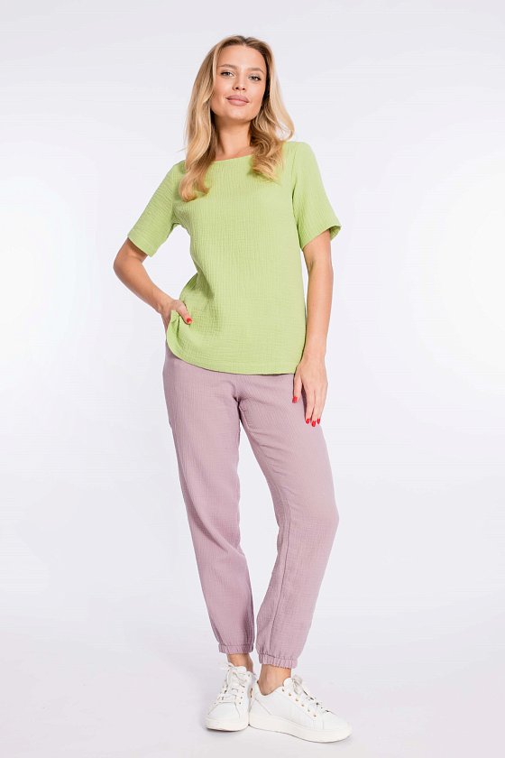 Футболка выполнена из хлопкового полотна - муслина. С коротким втачным рукавом и овальным вырезом горловины. Внизу, в боковых швах небольшие разрезы.