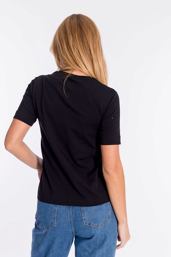 Женская футболка выполнена из однотонной кулирки с лайкрой. С коротким рукавом и круглым вырезом горловины, оформленным планкой.