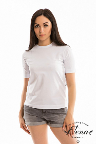 Женская футболка выполнена из однотонной кулирки с лайкрой. С коротким рукавом и круглым вырезом горловины, оформленным планкой.