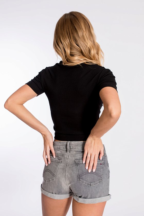 Футболка укороченная выполнена из однотонной кашкорсе-вискозы. С коротким рукавом и круглым вырезом горловины.