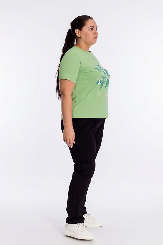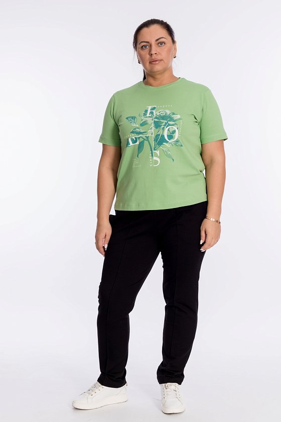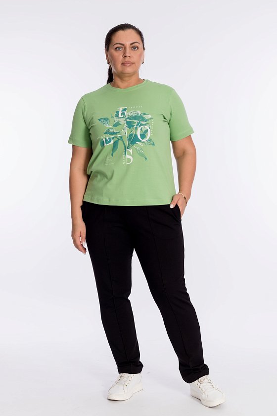 Женская футболка полуприлегающего силуэта выполнена из однотонной кулирки с лайкрой. С коротким рукавом и круглым вырезом горловины, оформленным планкой. Спереди нанесён принт.