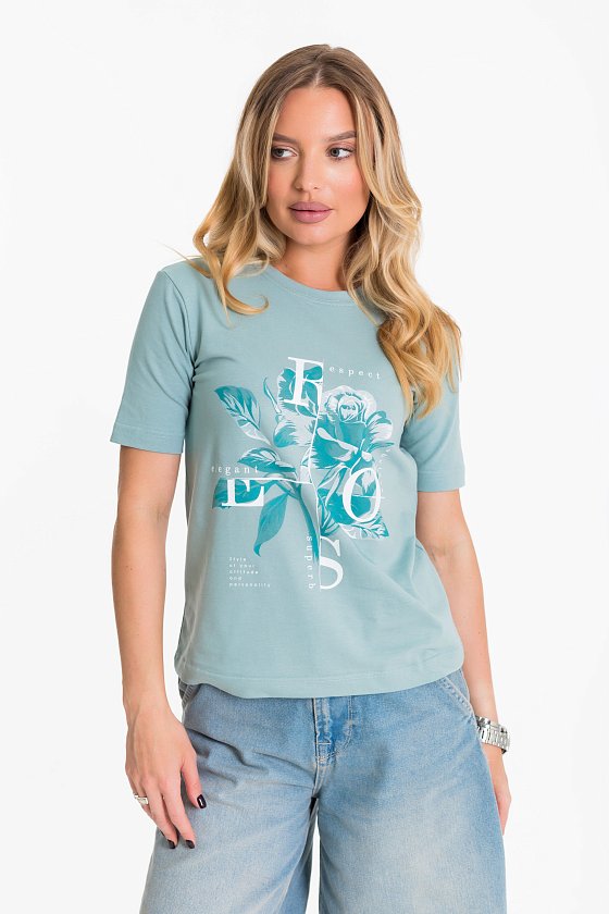 Однотонная футболка из кулирки с лайкрой. Короткий рукав, притачная планка по горловине, на полочке принт.