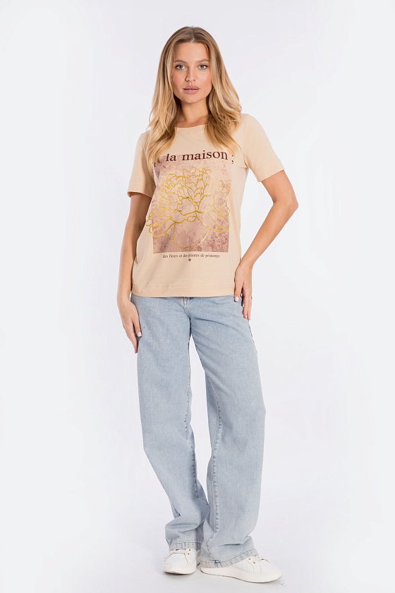 Футболка свободного силуэта из однотонной кулирки, 100% хлопок. С коротким втачным рукавом и притачной планкой по горловине. Спереди нанесён принт.