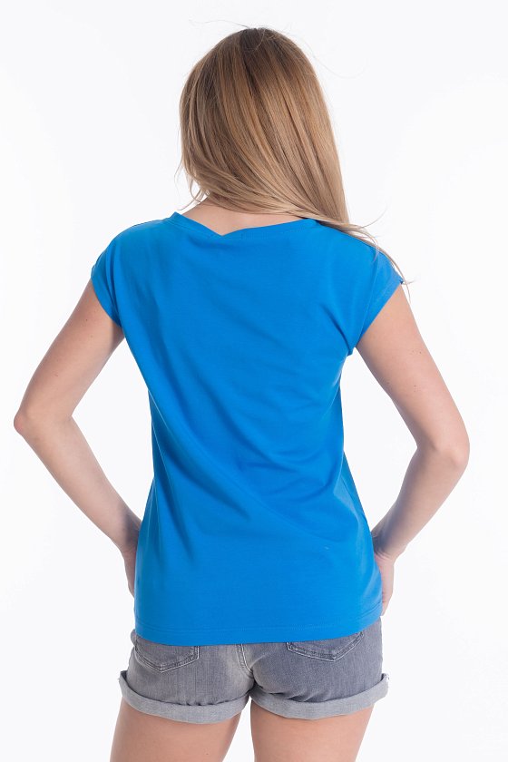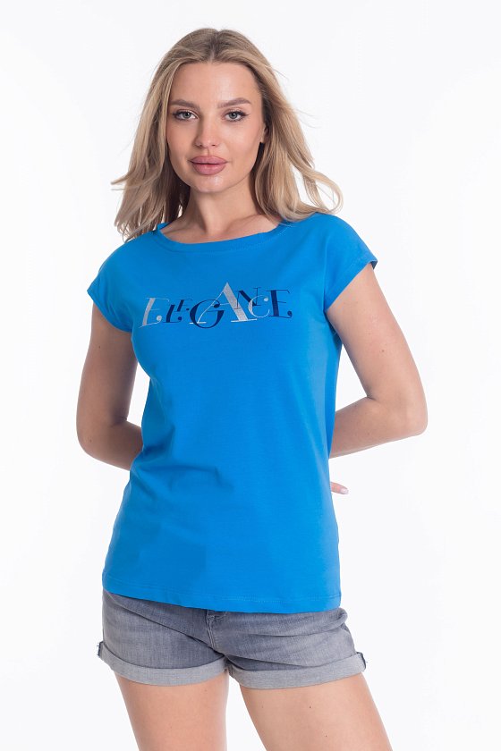 Особенностью модели является спущенная линия плеча и горловина в форме лодочки, которые придают футболке оригинальный вид. Наличие принта спереди делает её стильным элементом вашего гардероба.