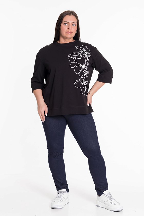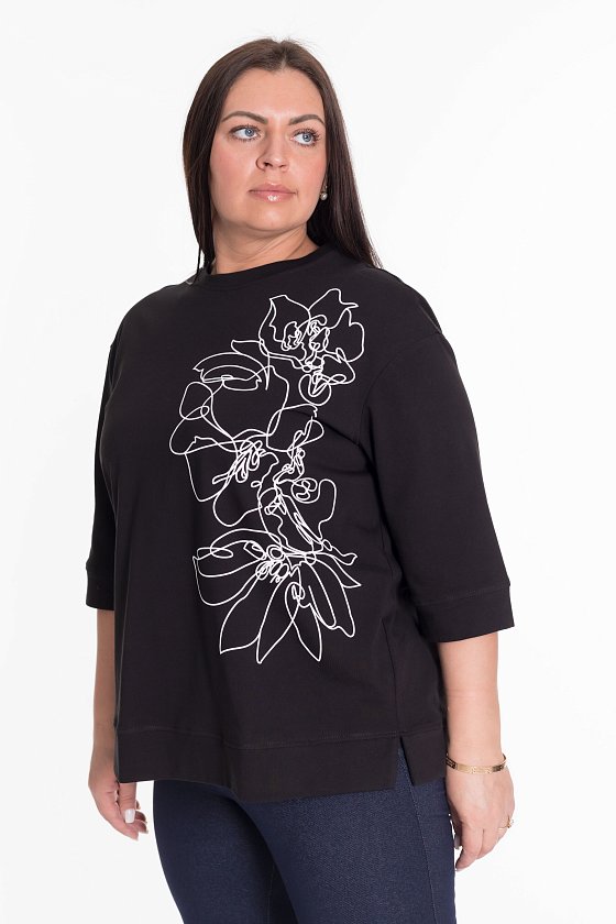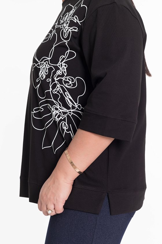 Футболка выполнена из однотонной кулирки. Рукава длиной 3/4, круглый вырез горловины оформлен планкой. Спереди расположен красивый принт. Внизу, в боковых швах декоративные разрезы.