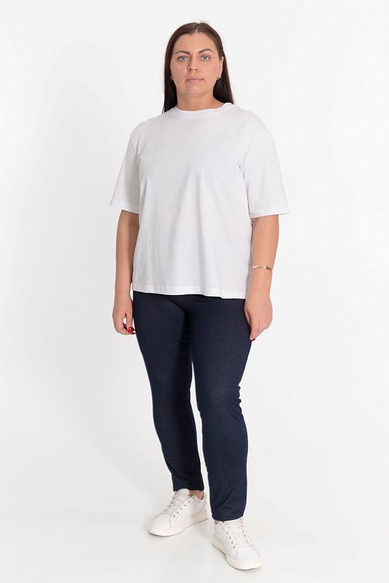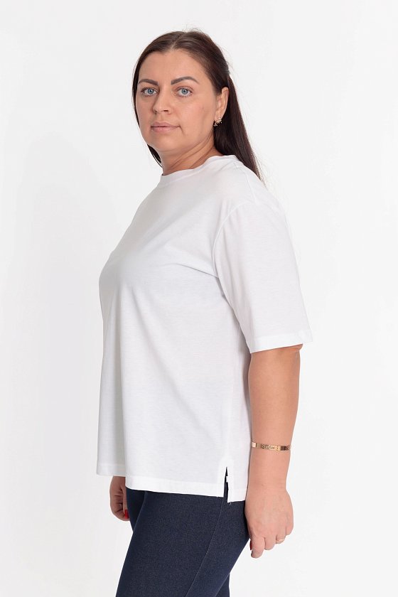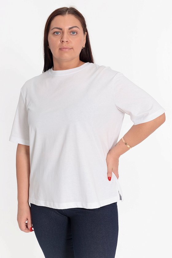 Футболка выполнена из однотонной кулирки, 100% хлопок. С коротким рукавом и круглым вырезом горловины, оформленным планкой. Внизу, в боковых швах декоративные разрезы.