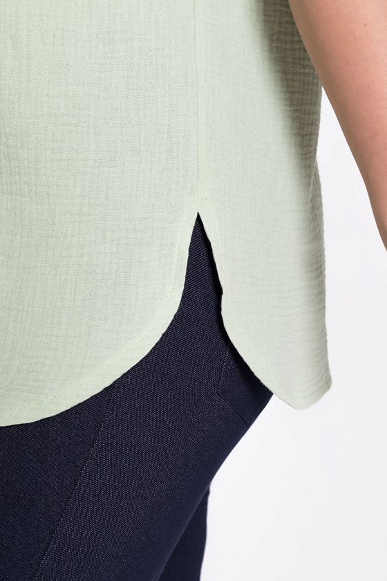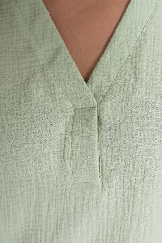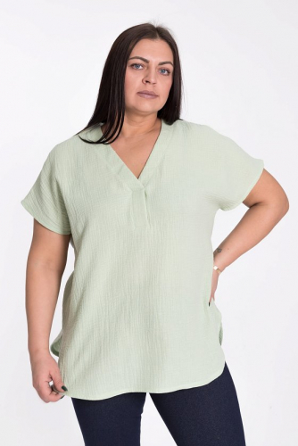 Женская футболка выполнена из мягкого и лёгкого муслина цвета полынь. Она имеет V-образный вырез горловины, что придаёт изделию элегантность и женственность. Футболка оснащена цельнокроеным коротким рукавом, который обеспечивает свободу движений. Боковые срезы линии низа закруглены, что добавляет изделию мягкость и комфорт. Однотонный цвет футболки позволяет сочетать её с различными элементами гардероба. Эта футболка станет отличным выбором для повседневной носки, обеспечивая удобство и стиль.