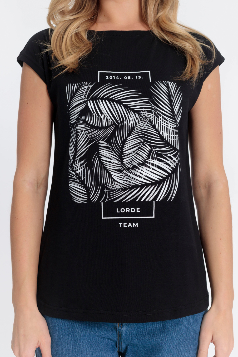 Спущенная линия плеча, горловина "лодочка", спереди принт. Хлопок 95% Лайкра 5%
