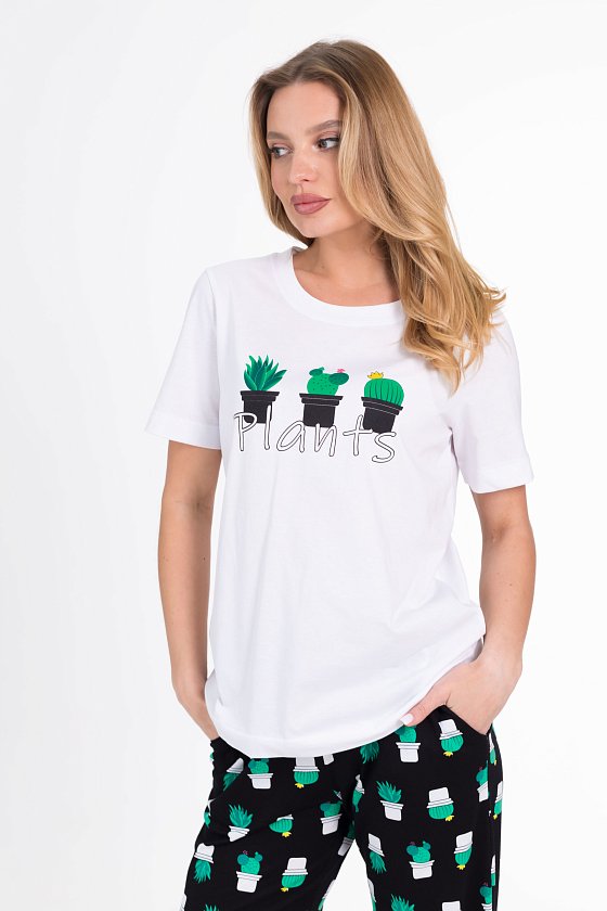 Однотонная футболка с коротким втачным рукавом, круглый вырез горловины, на полочке принт.
