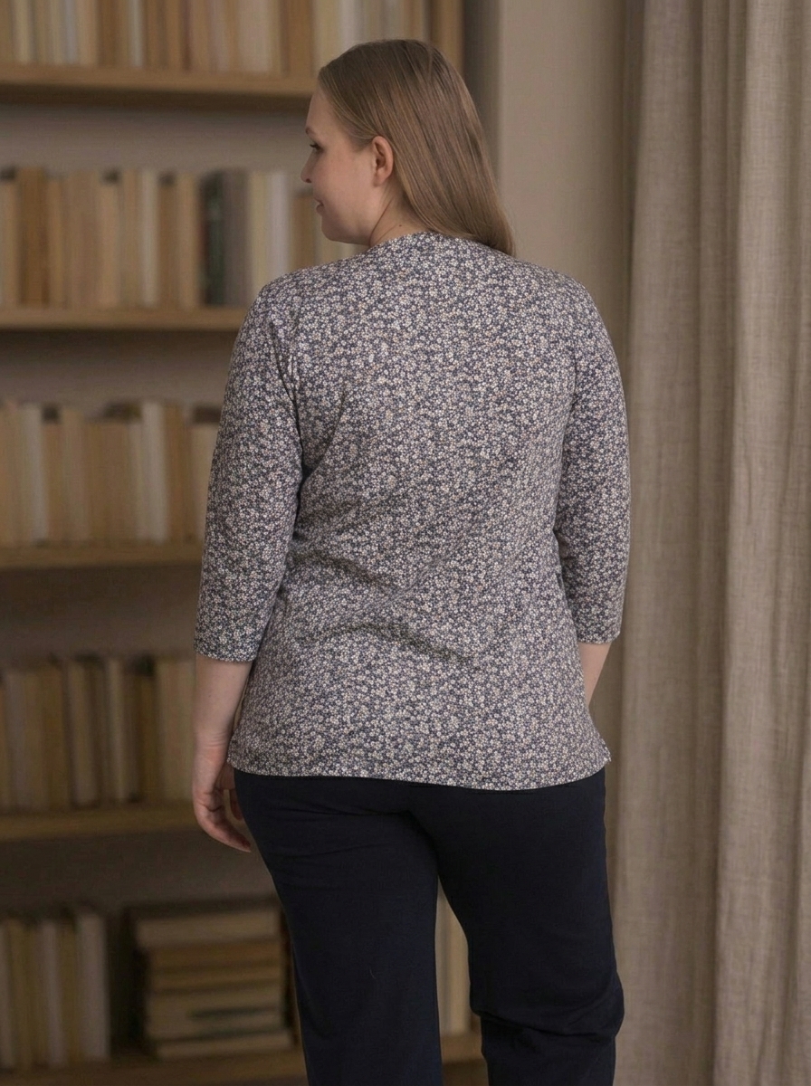 Женская футболка из 100%-ного хлопка с узором в мелкий цветочек — отличный выбор для повседневной носки. Она изготовлена из мягкой и приятной к телу ткани, которая обеспечивает комфорт в течение всего дня. Рукав 3/4 и фигурный вырез горловины придают изделию стильный вид. Футболка застёгивается на три пуговицы, а разрезы в боковых швах добавляют ей оригинальности. Эта футболка подойдёт для прогулок, неформальных встреч или отдыха. Её можно сочетать с различными элементами гардероба. Хлопок 100%