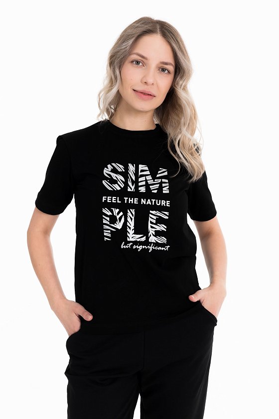 Женская футболка выполнена из однотонной кулирки с лайкрой. С коротким рукавом и круглым вырезом горловины, оформленным планкой. Спереди нанесён оригинальный принт.