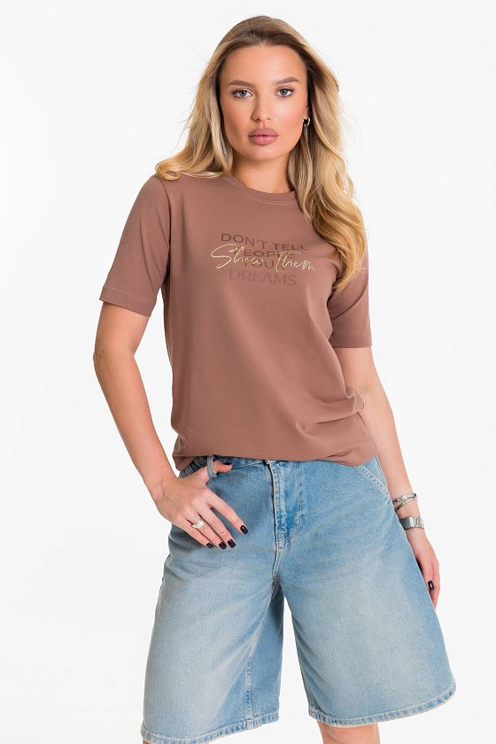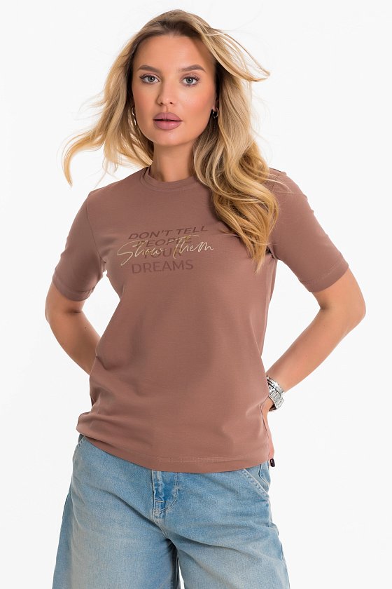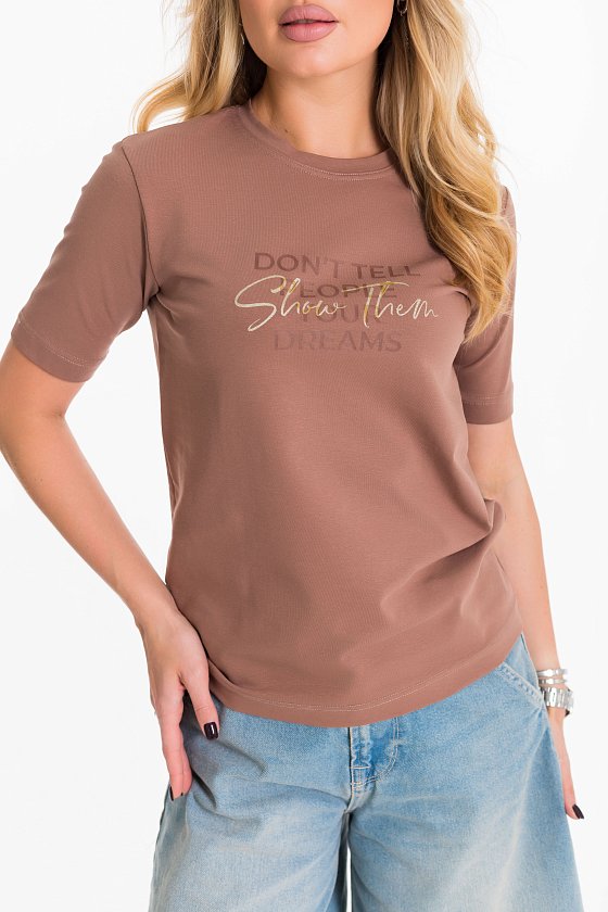 Футболка женская выполнена из хлопка с добавлением лайкры. С круглым вырезом горловины, коротким втачным рукавом и принтом спереди.