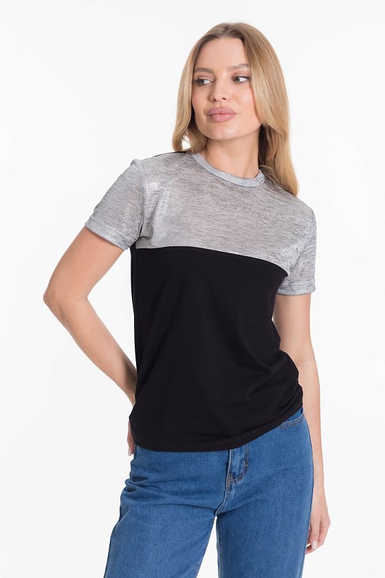Футболка из двух видов ткани - кулирки с лайкрой и вискозы цвета напыления серебра.