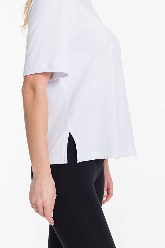Женская футболка однотонного белого цвета выполнена из мягкого и приятного на ощупь материала - кулирка. Она имеет короткий рукав и боковые швы с разрезами, что придаёт изделию оригинальность и свободу движений.
