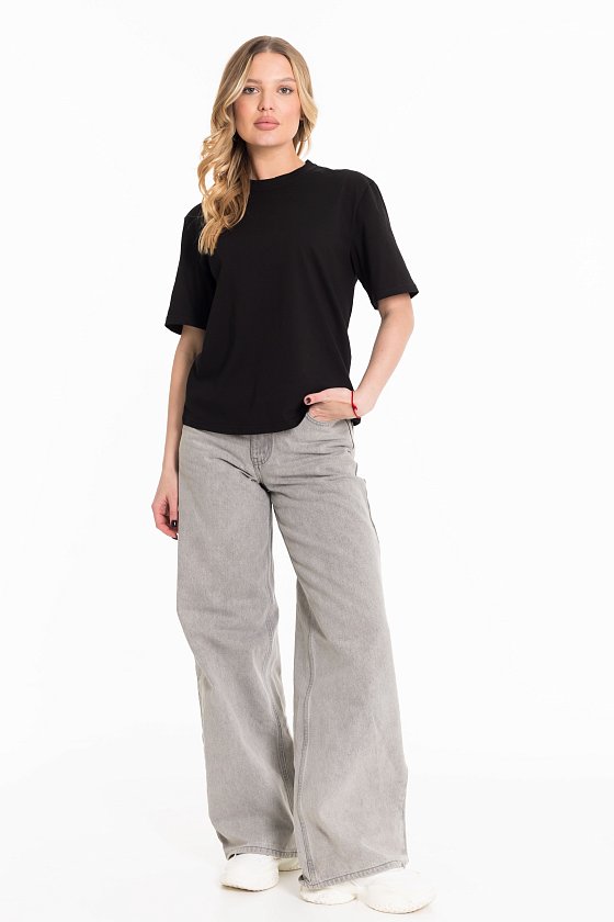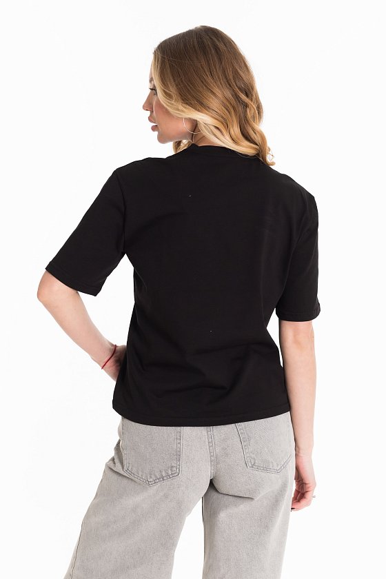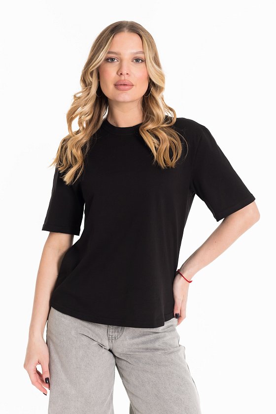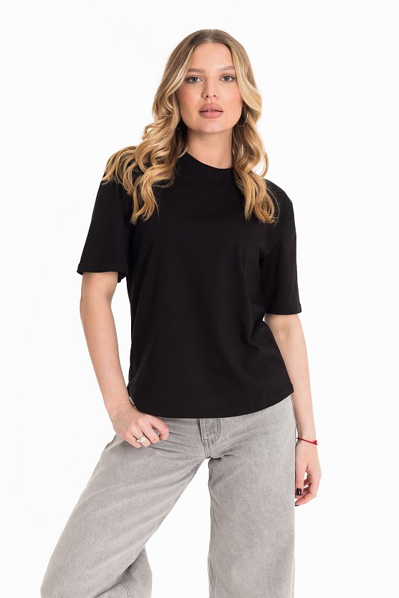 Женская футболка изготовлена из хлопкового полотна, что обеспечивает комфорт и хорошую воздухопроницаемость. Футболка имеет короткий рукав и круглый вырез горловины, что придает ей классический стильный вид. Такая модель базового черного цвета отлично сочетается с джинсами, брюками или юбкой. Изготовленная из натуральной ткани, футболка обеспечит комфорт в течение всего дня.