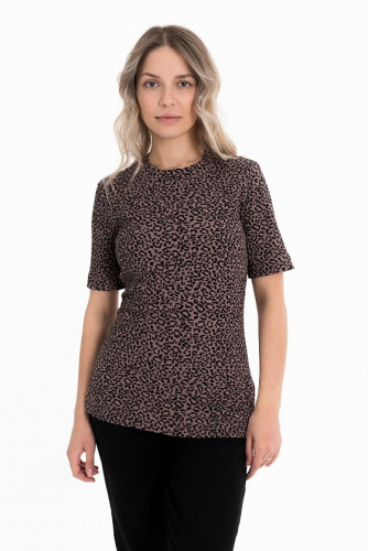 Женская футболка выполнена из однотонной кулирки с лайкрой. С коротким рукавом и круглым вырезом горловины, оформленным планкой. Спереди нанесён принт.