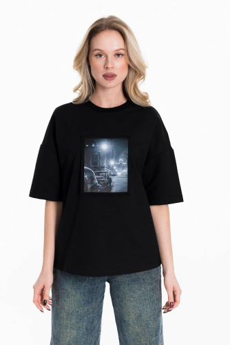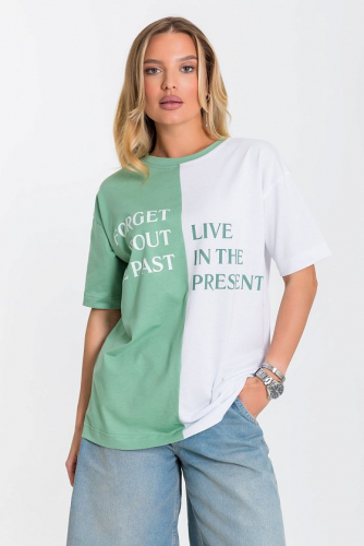 Футболка выполнена из однотонной кулирки двух цветов. С коротким рукавом и круглым вырезом горловины, оформленным планкой. Спереди нанесён оригинальный принт.