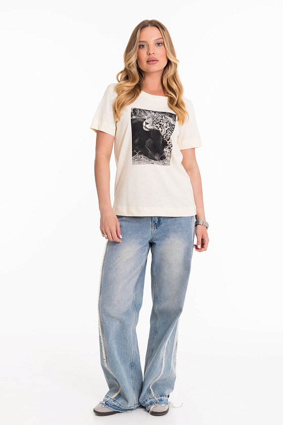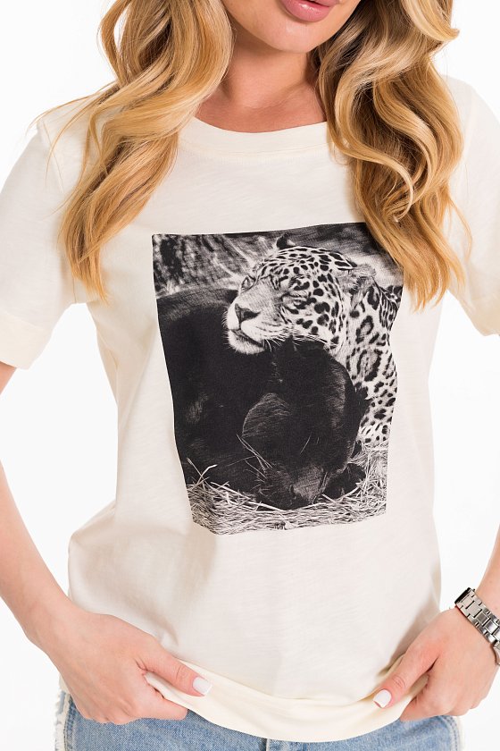 Женская футболка с принтом изготовлена из хлопкового полотна - кулирка "фламли", что обеспечивает комфорт и хорошую воздухопроницаемость. Футболка имеет короткий рукав и круглый вырез горловины, что придает ей классический стильный вид. Такая модель футболки отлично сочетается с джинсами, брюками или юбкой. Изготовленная из натуральной ткани, футболка обеспечит комфорт в течение всего дня.