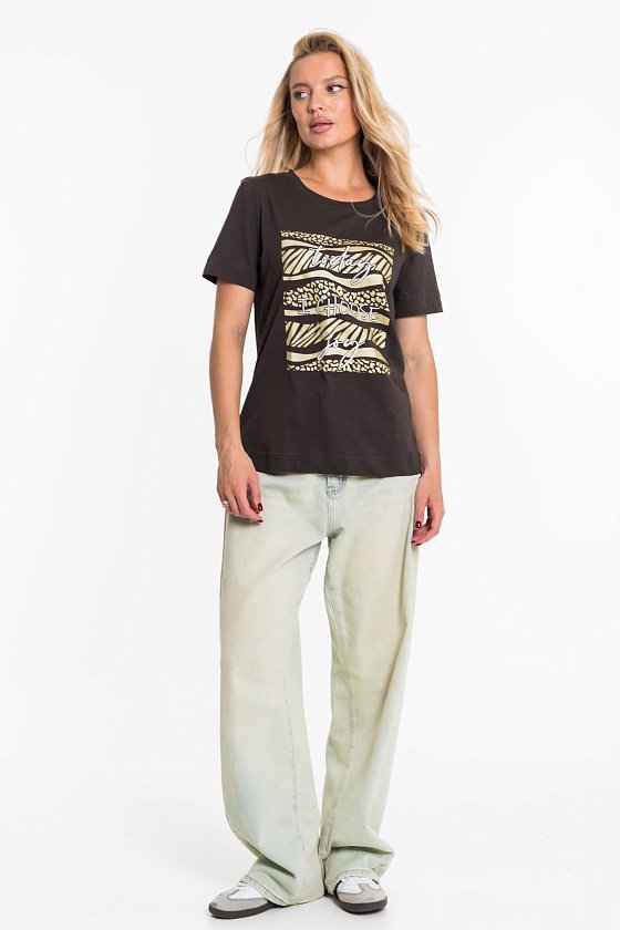 Женская футболка с принтом изготовлена из хлопкового полотна - кулирка "фламли", что обеспечивает комфорт и хорошую воздухопроницаемость. Футболка имеет короткий рукав и круглый вырез горловины, что придает ей классический стильный вид. Такая модель футболки отлично сочетается с джинсами, брюками или юбкой. Изготовленная из натуральной ткани, футболка обеспечит комфорт в течение всего дня.