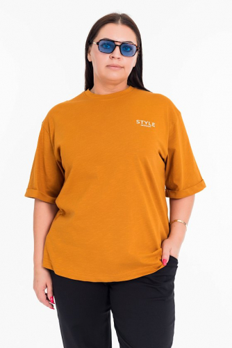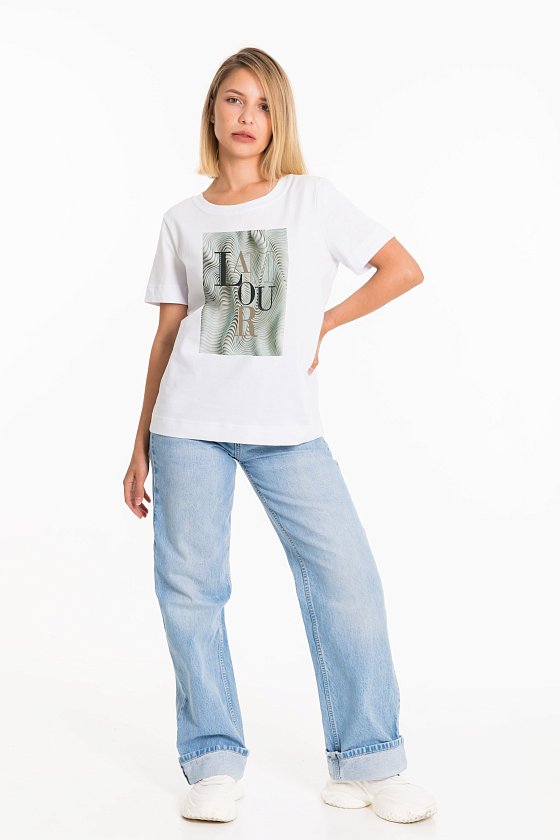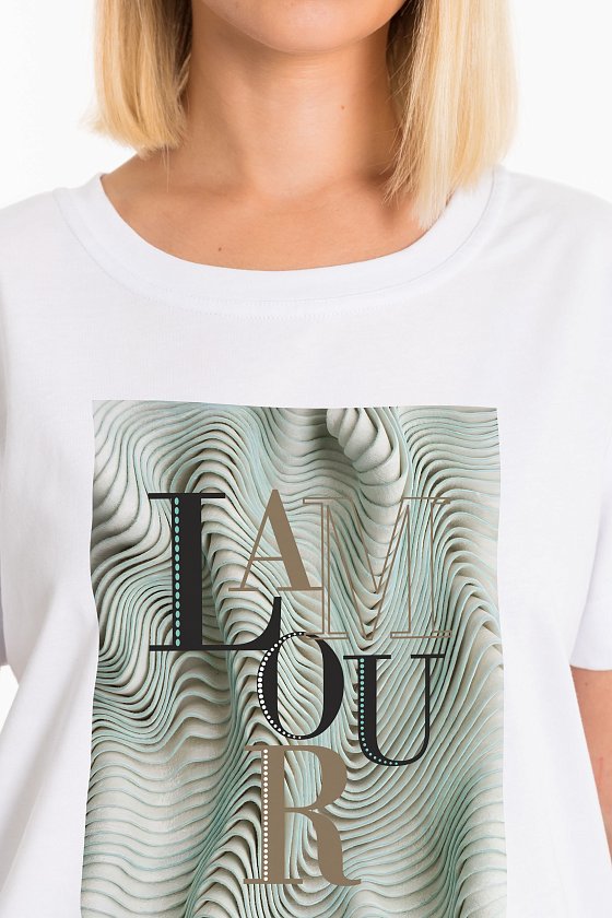 Футболка из однотонной кулирки, 100% хлопок. С коротким втачным рукавом и притачной планкой по горловине. Спереди нанесён принт.