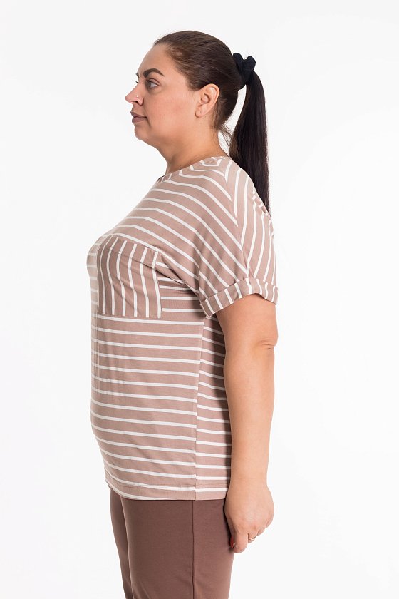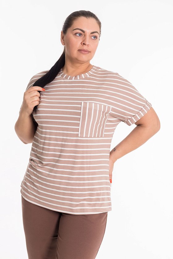 Футболка из вискозного полотна в полоску — базовая модель с современными деталями. Спущенный рукав создаёт мягкий, расслабленный силуэт. Горловина с притачной планкой и отвёрнутые налицо манжеты добавляют чёткости форме. Функциональность и стиль завершает накладной карман на полочке. Универсальная модель для создания повседневных образов.