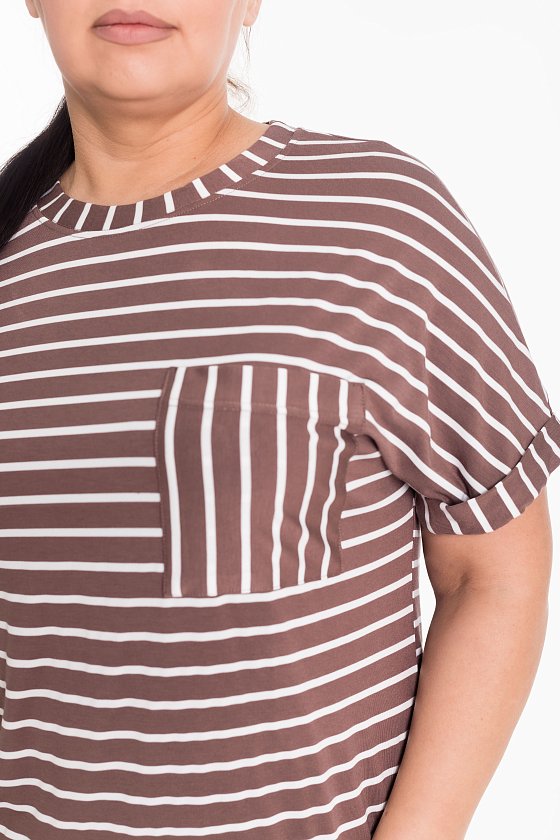 Футболка из вискозного полотна в полоску — базовая модель с современными деталями. Спущенный рукав создаёт мягкий, расслабленный силуэт. Горловина с притачной планкой и отвёрнутые налицо манжеты добавляют чёткости форме. Функциональность и стиль завершает накладной карман на полочке. Универсальная модель для создания повседневных образов.