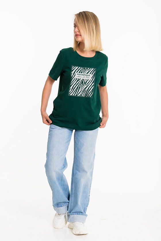 Футболка из однотонной кулирки, 100% хлопок. С коротким втачным рукавом и притачной планкой по горловине. Спереди нанесён принт.