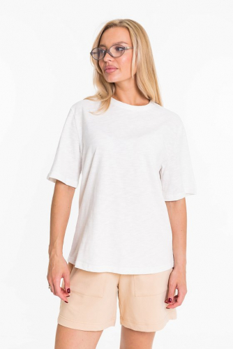 Женская футболка изготовлена из хлопкового полотна - кулирка "фламли", что обеспечивает комфорт и хорошую воздухопроницаемость. Футболка имеет короткий рукав и круглый вырез горловины, что придает ей классический стильный вид. Такая модель футболки отлично сочетается с джинсами, брюками или юбкой. Изготовленная из натуральной ткани, футболка обеспечит комфорт в течение всего дня.